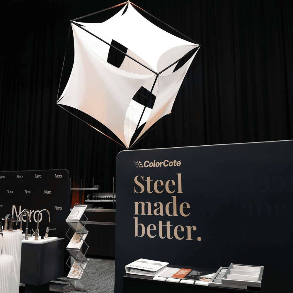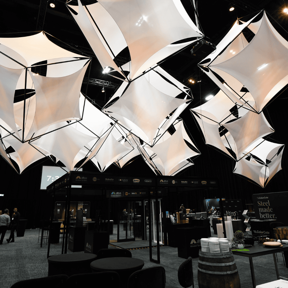 Suspended overhead, the installation introduced bold geometric forms that reflected architectural elements while adding strong visual presence. The result set the tone for a detail-focused, design-led event.