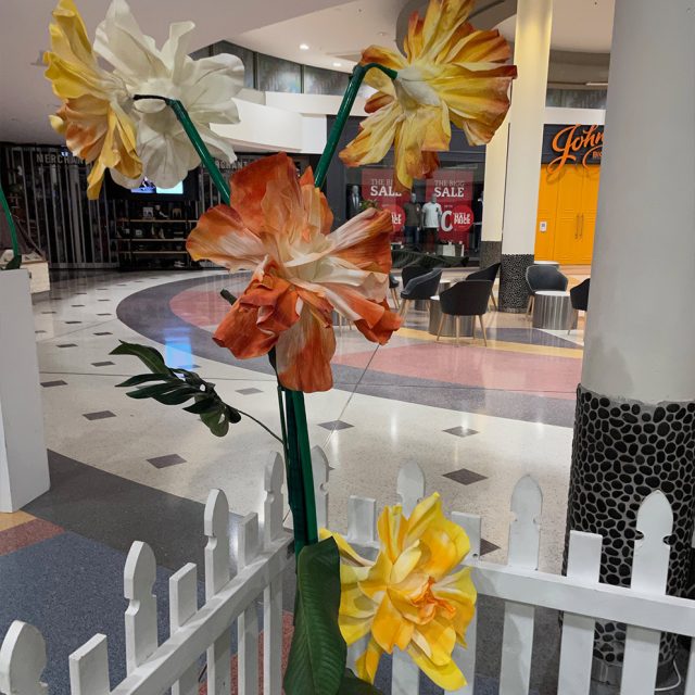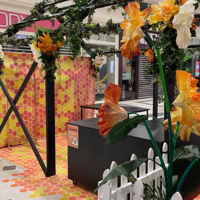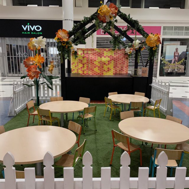 We defined the work activity space for customers using our astroturf flooring and white picket fencing, dotted with freestanding large floral clusters and informative ‘bee fact’ signage.