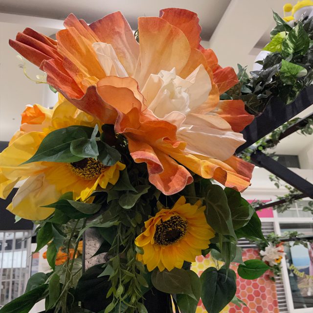 Our great range of artificial greenery along with our large fabric flowers in shades of yellow and orange, transformed the main wooden structure into a vibrant hub of activity.