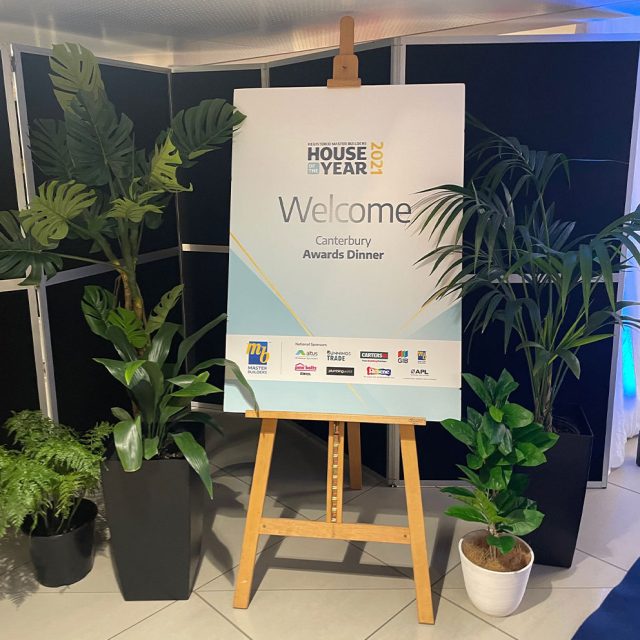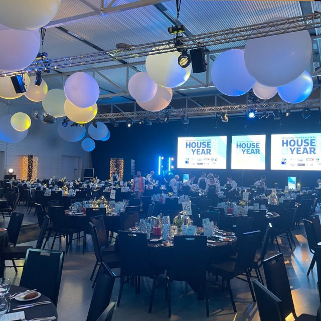 Lit with shades of blue and pops of gold to match the branding for the event, they provided an eye-catching canopy above 63 tables of talented Cantabs from the housebuilding industry enjoying an evening celebrating NZ’s best homes.