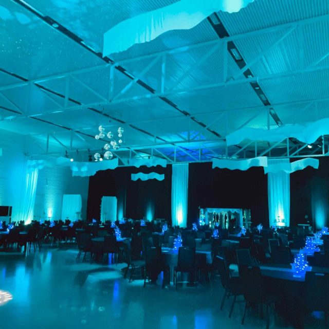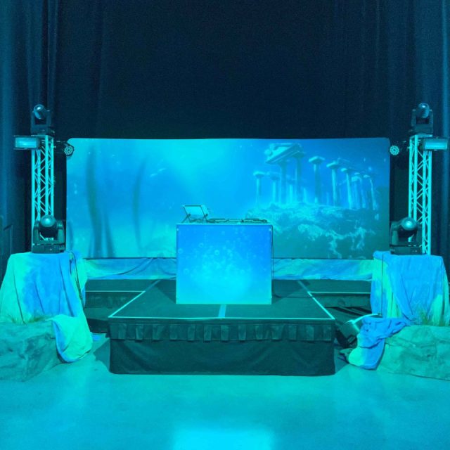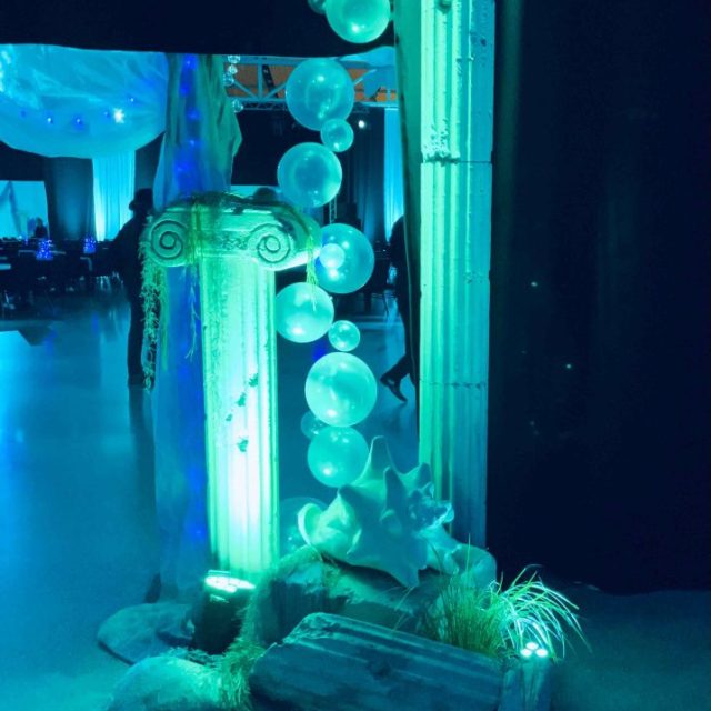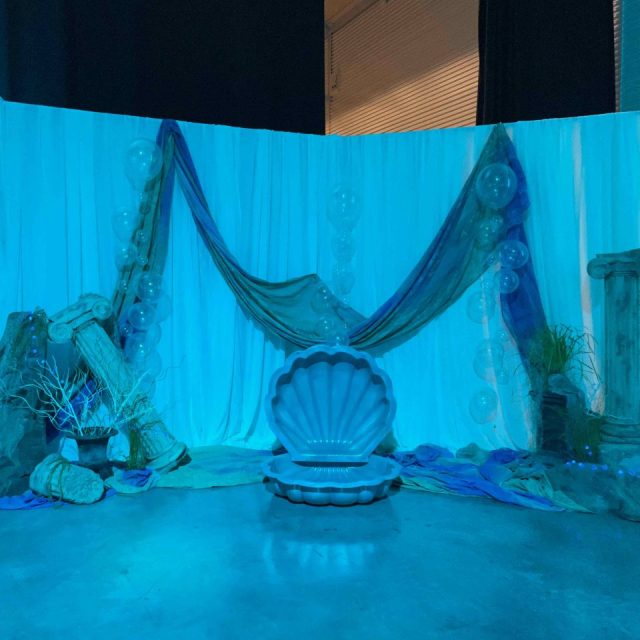 We had a blast creating this magical underwater look using ancient ruin columns, fibreglass rocks, dyed water effect fabric, balloon ‘bubbles’ and ‘seaweed’ looking plants.