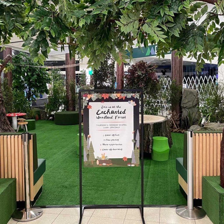 The team got a good workout carrying two truckloads and a trailer full of gear through Christchurch Airport to transform a section of the upstairs cafe court seating area into an ‘enchanted woodland forest’ to support their Easter holiday activation.