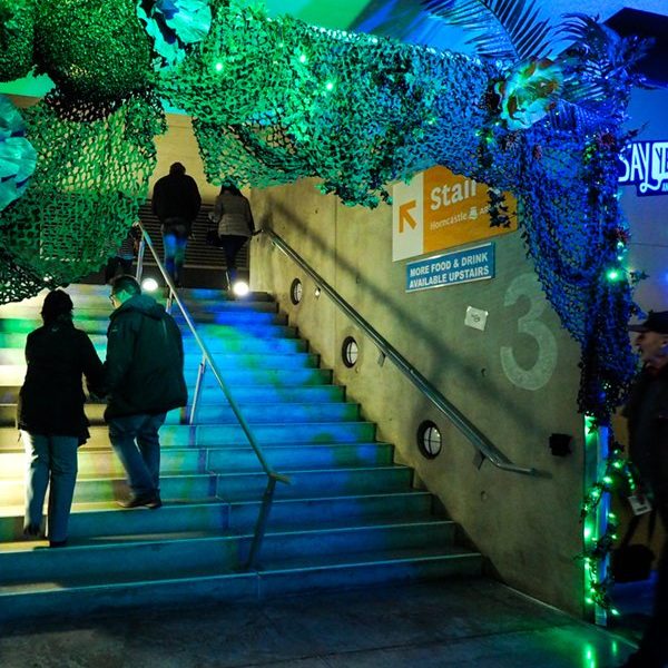 Framing each stairwell were large archways, covered in foliage, fairy-lights and oversized flowers adding spots of colour within the space. These features, combined with themed lighting helped to incorporate and continue the Pandora environment from the entrance thru to the main event.