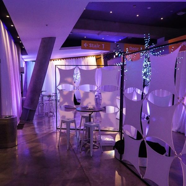 For VIP guests Theme Productions created an intimate elegant space framed with white silk draping, and illuminated with textured gobo lighting. Further white silk draping bunched with fairy-lights formed a welcoming entrance drape. Tall white fairy-light trees and a white archway above their stairwell matched the luxe white-on-white feel with the Pandora environment. A glowing bar and white lycra room dividers completed the VIP look.