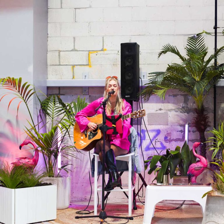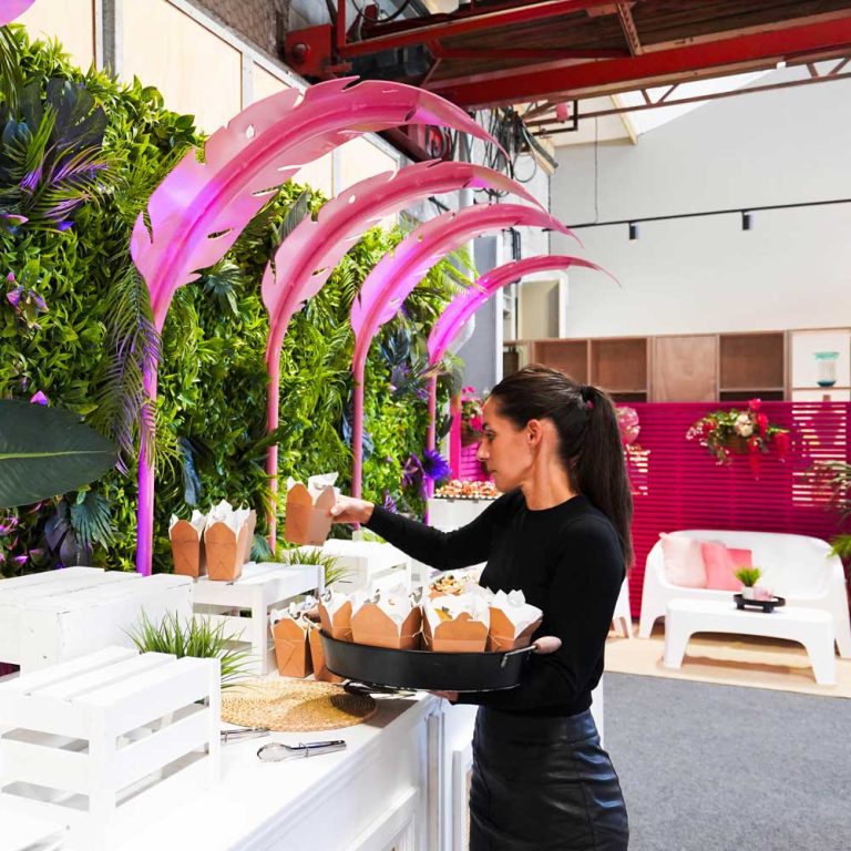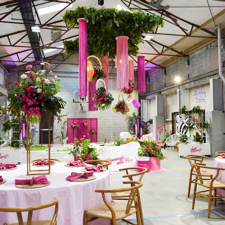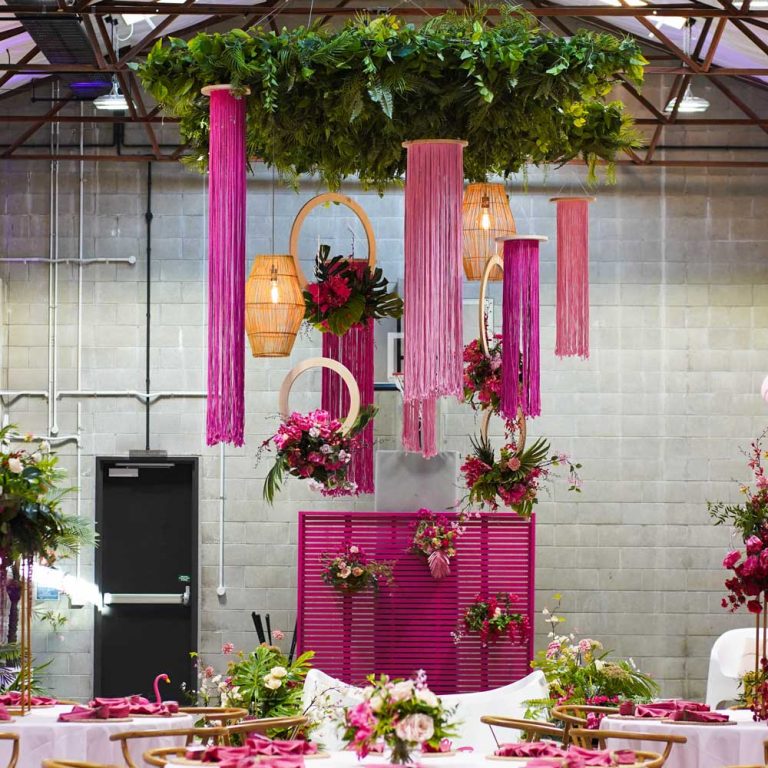 As soon as guests entered the Mace Space at The Majestic on Durham, they were transported to a tropical paradise! The vibrant pink tones flowed harmoniously through the florals, entertainment, catering, and lighting, tying the entire design together. From the stunning chandelier feature to the playful photo moments, the flamingo and tropical motifs brought the theme to life in every corner.