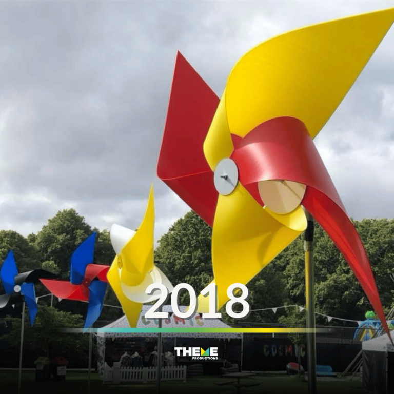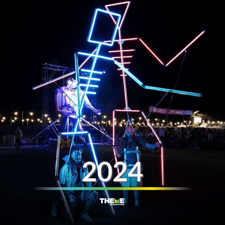From festival flags, large acrylic flowers and windmills, to giant moth shelters, oversized palms in VIP zones, massive interactive robots, and LED stick people, each year has brought new challenges and creative opportunities. In 2026, we scaled up again with a custom stage façade, site-wide brand activations, and even some large LED jellyfish to float above the sea of people as day turns into night.