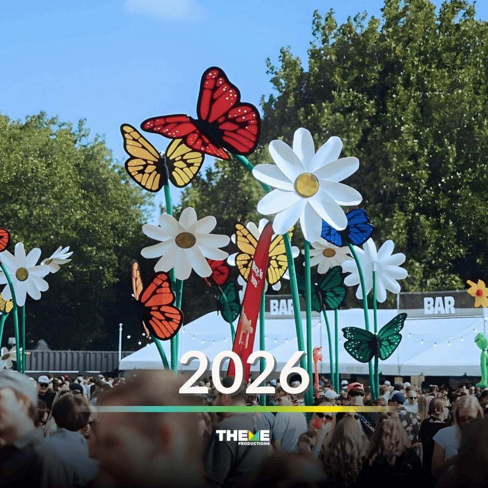 From festival flags, large acrylic flowers and windmills, to giant moth shelters, oversized palms in VIP zones, massive interactive robots, and LED stick people, each year has brought new challenges and creative opportunities. In 2026, we scaled up again with a custom stage façade, site-wide brand activations, and even some large LED jellyfish to float above the sea of people as day turns into night.