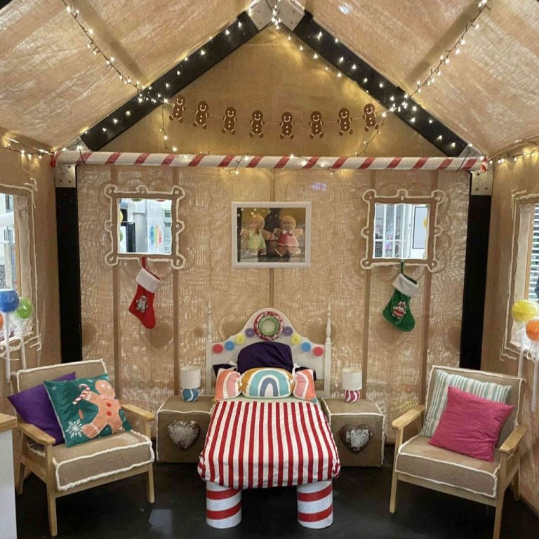 We worked hard into the early hours of the morning putting finishing touches on this delightfully festive installation. With it’s candy coated gingerbread house, and candy snow man!