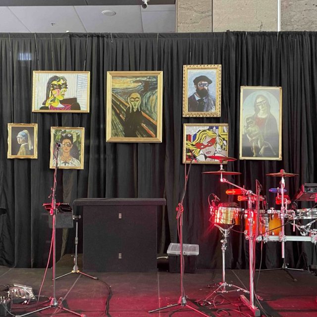 Replicas of famous artworks were tweaked to incorporate masks and grouped together to watch over the dance floor as the band Puree had the party pumping. A tight three hour set up time, meant the power of many hands working together… Always a pleasure to work with the team Multimedia Systems to illuminate and elevate the magic!