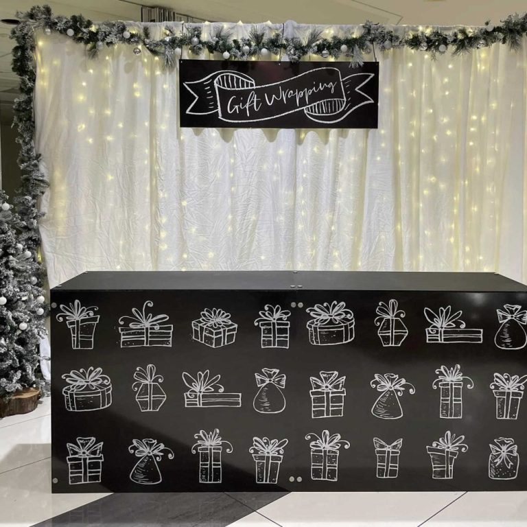 The magical installation was accentuated with warm white lighting that highlighted the gift wrap station and Santa photo moment.