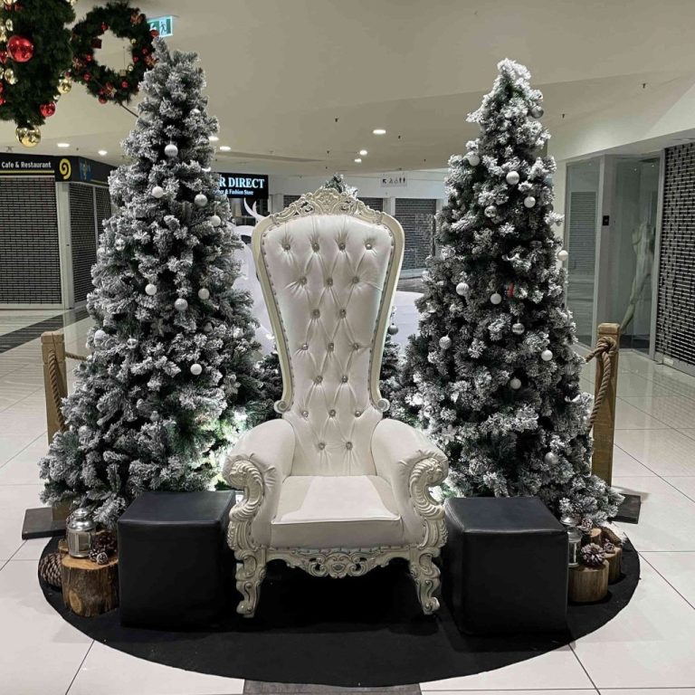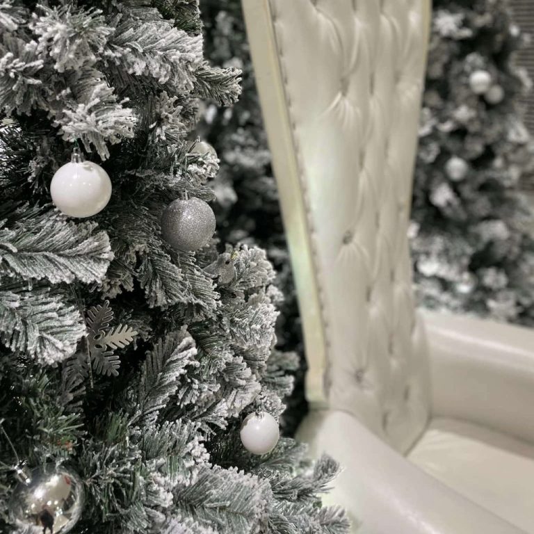 Our frosted trees scattered with white and silver decorations, framed the fairy light curtain, Santa’s throne, and Remy the Reindeer.
