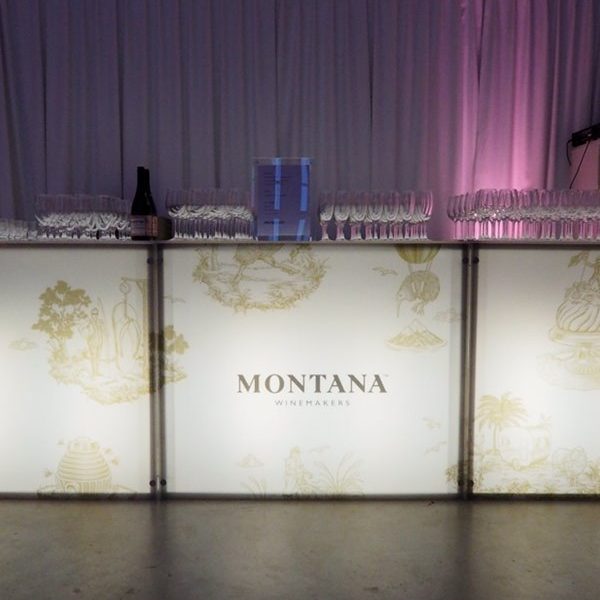 Guests were then greeted by ‘gold girls’ thanks to Epic Entertainment, inviting guests to help themselves to our champagne wall. Beside the champagne wall, was a topiary wall, with white floral décor and themed cut-out pieces for photo opportunities. Our internally lit bar glowed all night, with a full custom printed branded face. Our herringbone wooden bar was the dessert bar for later on in the evening. A gold gumboot with a matching gold trowel added to the “glam” Kiwiana theme for the table centrepieces. The staging was flanked on either side, with large rustic floral pieces placed on clear acrylic plinths.