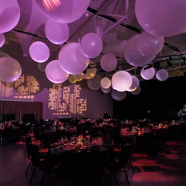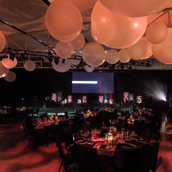 Guests walked through a large lycra tunnel revealing the main space. Giant balloons hung within the roof for a cloud-like traveling atmosphere. The stage backdrop consisted of large cityscape panels completing the cityscape gobo lighting effects, projected onto the walls, thanks to ETS. A Large LED screen hung centered to the large split stage for the band, providing live ‘Sting’ music for the formalities. The LED screen also showed custom-built video content matching Epic Entertainment’s amazing whirlwind performance. The photo area created a relaxing travel stop with suitcases, lamp pot, park bench, travel maps, and a large glowing moon.