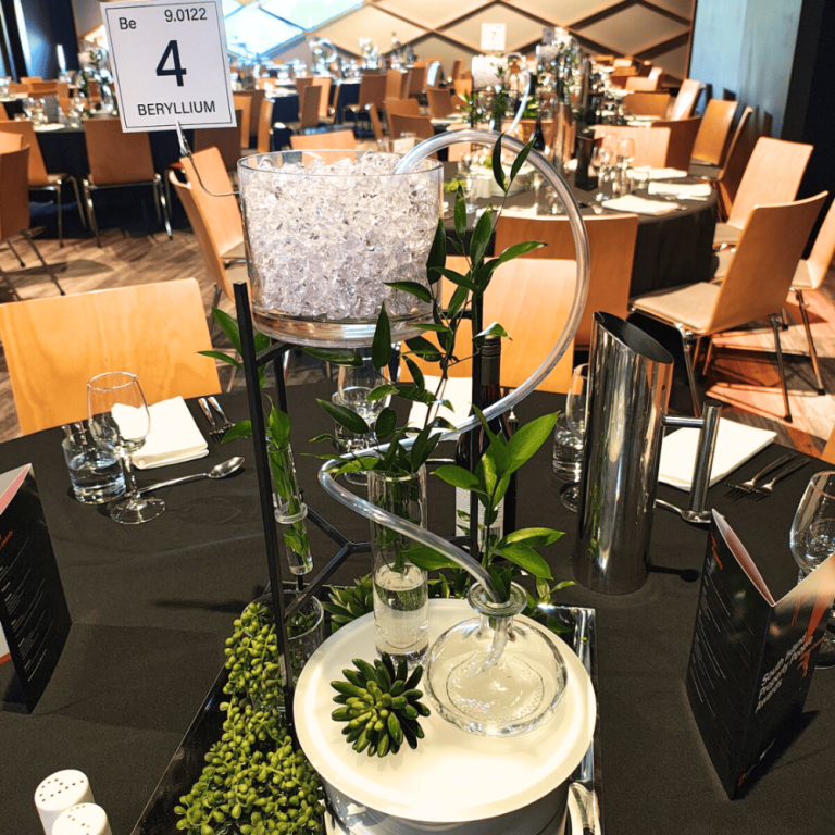 The thematic journey continued into the dinner venue, where the atmosphere shifted into Botanical Alchemy. Lab-inspired glassware centrepieces filled with fresh greenery and subtle lighting created a refined, elegant environment where science met nature.