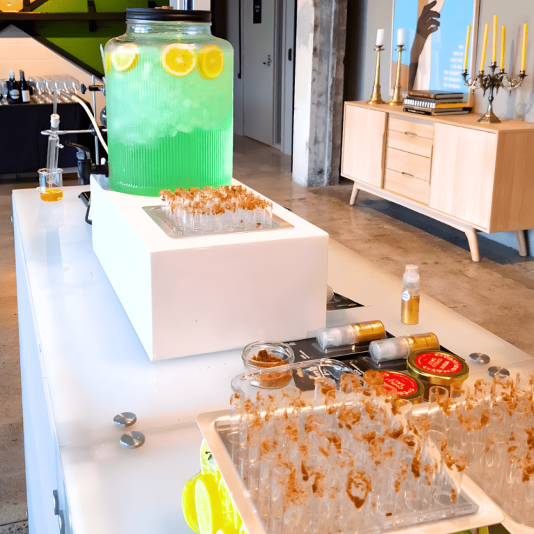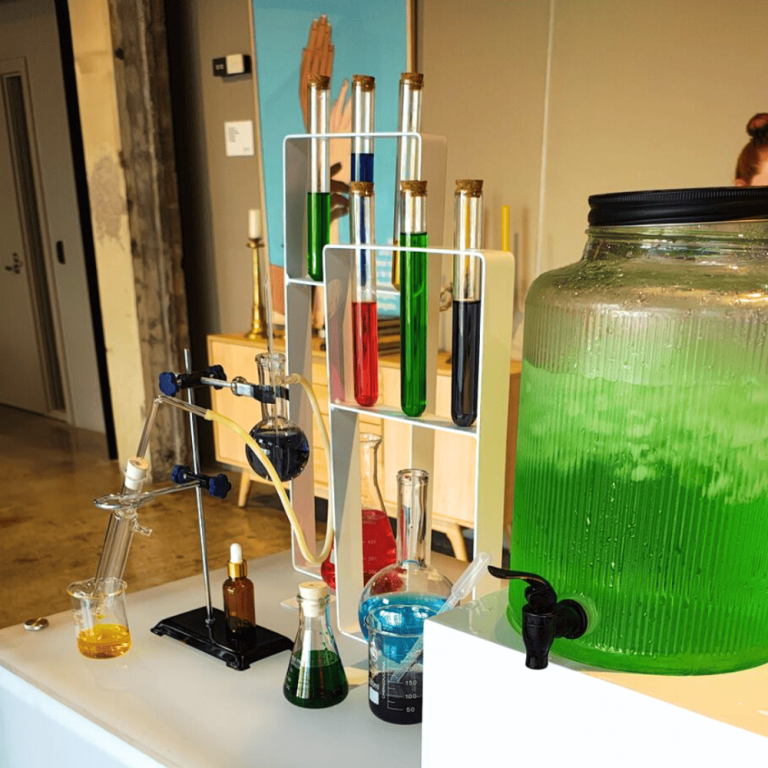 Guests entering the main foyer were welcomed by our bespoke Mad Scientist Bar, complete with an eccentric “mad scientist” mixologist serving inventive test-tube cocktail tasters. A custom printed backdrop, our LED bars and carefully curated displays of beakers, test tubes, and lab props set the scene, filling the space with bubbling excitement from the moment doors opened.