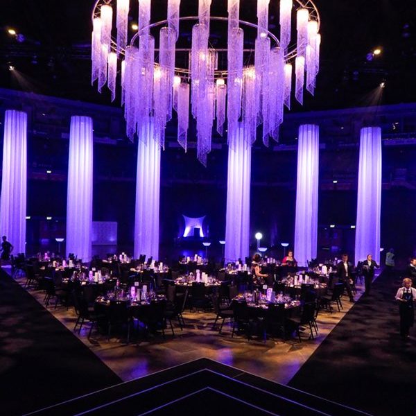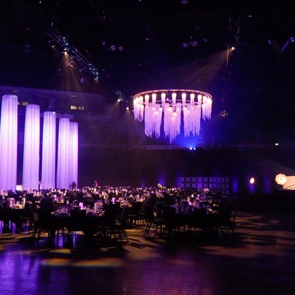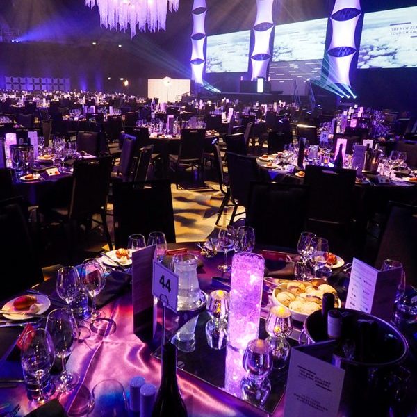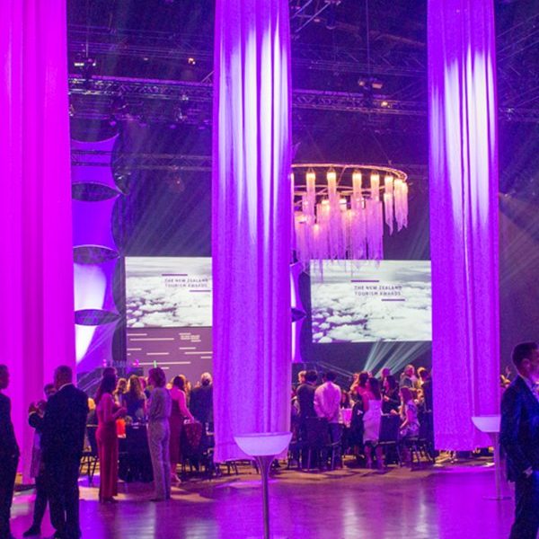 This year the New Zealand Tourism Awards were held at Horncastle Arena. Theme Productions had a great time designing and delivering the event. Purple was their colour to be highlighted throughout the evening and was applied to all of our décor items within the space. Pre-drinks were held at the back of the room, with our large silk cylinders separating the space from the seated dinner and awards. LED bar leaners were scattered around, and our internally lit bar glowed at either side of the room for guests to grab a bevy or two.