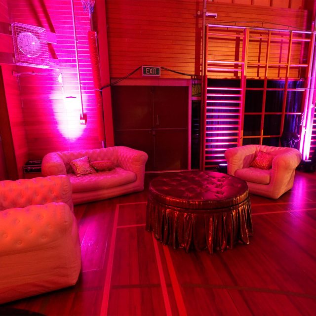 Guests were welcomed into the transformed gym through a fairy light canopy. Glowing bar leaners were scattered around the space with Epic Entertainment silk aerialist performing above guests upon arrival. An intimate whiskey lounge was created with gathered white silk draping and gold metallic fabric drops, our chesterfield style couches allowed guests to sit, relax and enjoy the whiskey tasting. A fairy-light curtain was the backdrop for fun or formal photos, white silk draping with gold metallic drops highlighted with up-lighting was the backdrop for the stage. Rangi celebrated in style with a birthday cake cutting and song. Once formalities were over the band kicked in for the official birthday bash fun.